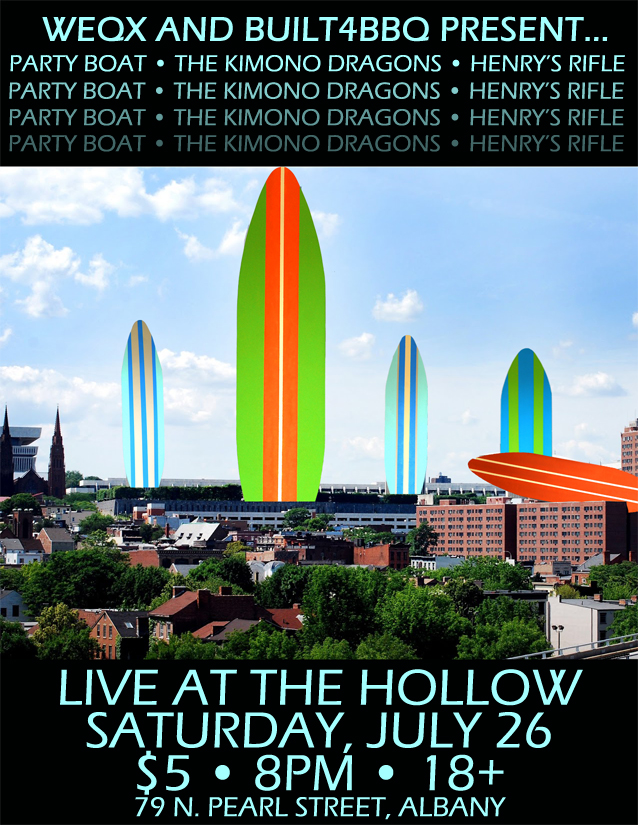 Built4BBQ and the good folks at WEQX and The Hollow Bar & Kitchen are bringing you one ripper of a show this Saturday! Ride a wave of surfy twang with Party Boat, The Kimono Dragons and Henry’s Rifle at downtown Albany’s finest establishment for one low, low price! You heard all three artists on the Built4BBQ Entree Comp, now catch ’em live, loud and in person. And in case you missed it, the mighty Dragons recently released their debut 3-song demo… give it a listen, we guarantee the best 10 minutes of your day.