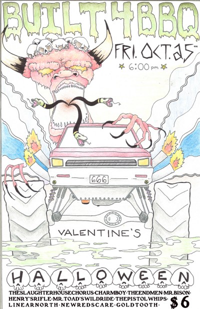 Next up on the show calendar, everyone’s favorite midwestern punk rock tunesmiths THE SLOW DEATH return to Valentines on Friday, November 15, with The Slaughterhouse Chorus and local party animals Drew & the Grand Spectacular and Boxer Brown in tow. If you like bands like Dillinger Four, the Replacements and the Lawrence Arms, the new Slow Death record will probably be the best purchase you make this year. If you like things like fun, rock music and good people, this show will probably be a worthy $5 investment as well. Also of note: this will almost definitely be the very last Built4BBQ production at 17 New Scotland Avenue. I’m getting depressed just typing that sentence. But hey, check out this bitchin’ show poster from the mind of Henry’s Rifle himself: